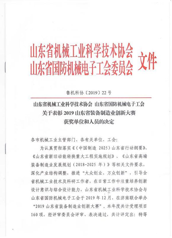 公司榮獲山東省裝備制造業(yè)創(chuàng)新大賽二等獎(jiǎng)